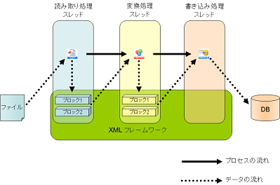 結果データを生成する(上図では、読み取り処理および変換処理)コンポーネントは、内部的に結果データを格納するブロック(たとえば1000行単位)を2つ保持するようになっています。