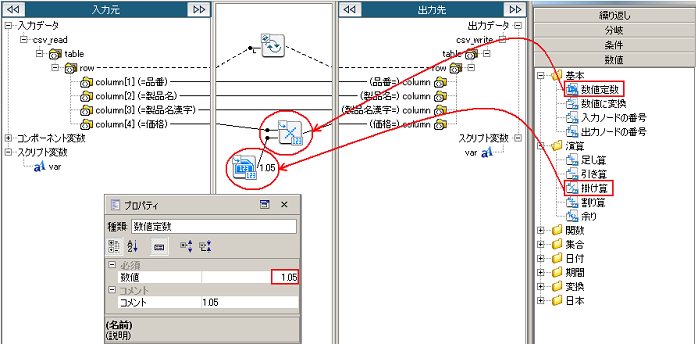 たとえば、入力データに数値「1.05」を加算し、出力するという処理の場合、以下のように設定します。