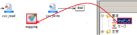スクリプトキャンバスにツールパレットの「変換」-「基本」-「マッピング」をドラッグ&ドロップすると、キャンバスにアイコンが配置されます。
