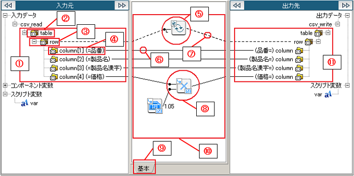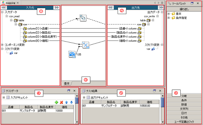 データの変換や加工を行うためのMapper専用ツールです。ツールパレットからマッピングキャンバスにドラッグ&ドロップで配置して使用します。 |